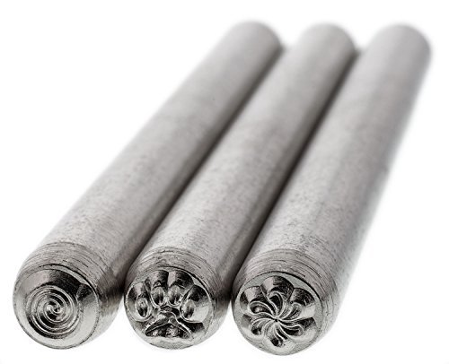 Stamp any flat, soft metal. 3 stamps included each with a different fun design. You will get a spiral, paw print and pinwheel design. Use this punch set to personalize metal blanks (made from non-ferrous metals such as Sterling Silver, Copper, Vintaj Natural brass and more). 3/16 Inch (5mm) design. Made of tempered steel for years of service. Use with a metal bench block or anvil and a 16 ounce flat head hammer. Hold your blank in place on a bench block using simple masking tape. The masking tape can also act as a guide to assure your design is in the right spot. Measurements: Punch is 3" in length. Design width for stamps is 5mm (3/16 Inch). Quantity: 3 stamps (each has a different design).