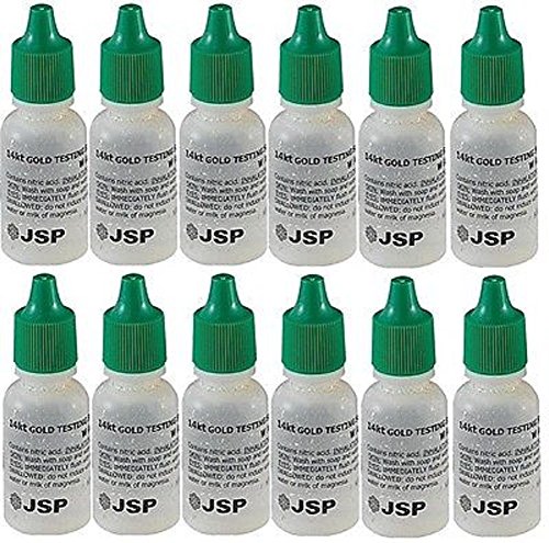 You will receive 12 bottles of 14 Karat Testing Acid, used to determine the Gold content of the piece being tested. · Each bottle has 1/2 fl oz of acid. · The sturdy plastic bottles maximize safety and allow the user to easily squeeze out one drop at a time. · All bottles have different cap colors to help keep acid karats organized easier · Latex Gloves are recommended with the use of any testing acids for safety · testing instructions included · black testing stone is recommended (sold separate from acids) ·