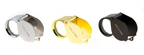 SE is proud to present our 3-Piece Set of 10x 21 mm Black/Gold/Silver Jeweler's Loupes. Our metal loupes are perfect for coin and stamp collectors, and everyday use. With our set of 3, it is easy to have one on hand whenever you need one for your backpack, briefcase, car, drawer, pocket, or purse at home or work.
