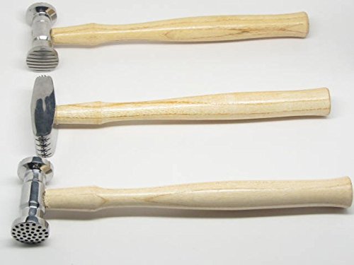 This set of 3 metal texturing hammers includes three hammers, each with two different textures on each side of the hammer head. Set includes one hammer with a dimples and thin stripes textures, one hammer with asterisk and diamond textures and one hammer with square and thick stripes textures. The hammer heads are not hardened, so that as they wear, the more interesting the patterns become. Each hammer is 10" long overall and is value-priced.