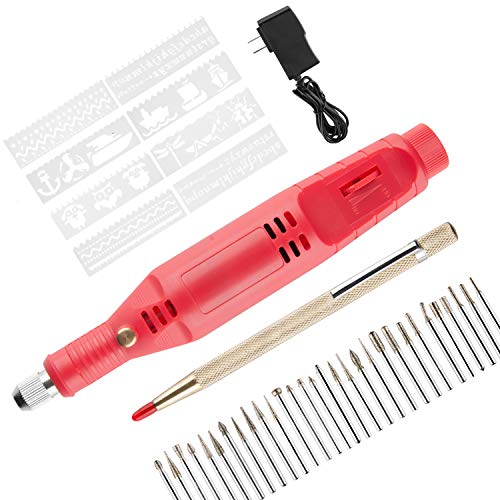 - VARIOUS ACCESSORIES: Package includes an electric micro engraver pen; 10 pointed bits, 5 round bits, 4 jujube-shaped bits, 11 flat bits; 32 stencils of various shapes and an etcher . So that you can engrave your favorite patterns.