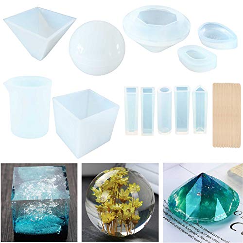- ★ VARIOUS SHAPES: A great combination of different shapes silicone molds, with Sphere, Cube, Diamond, Pyramid, and Water drop shape, also comes with 1 measurement cup and 10 pcs wood sticks. You could create different art projects and have a lot of fun.