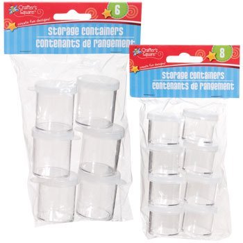 Small round plastic containers are perfect for storing beads, stickers, glitter, and other small craft items. Containers come in 2 different sizes and each has a snap-on plastic lid. Also perfect for storing nuts, washers, small screws, thumbtacks... the possibilities are endless!
